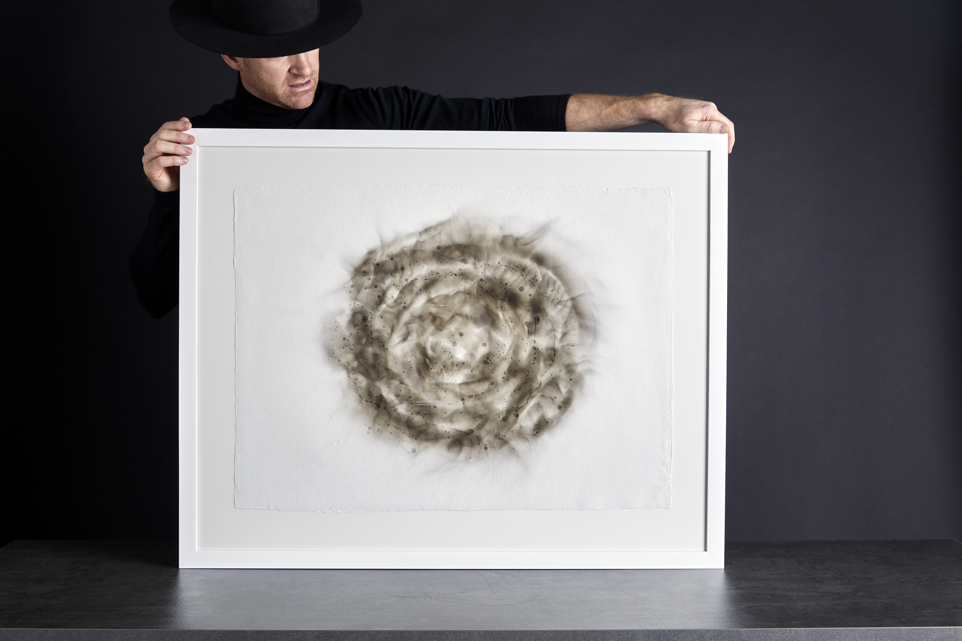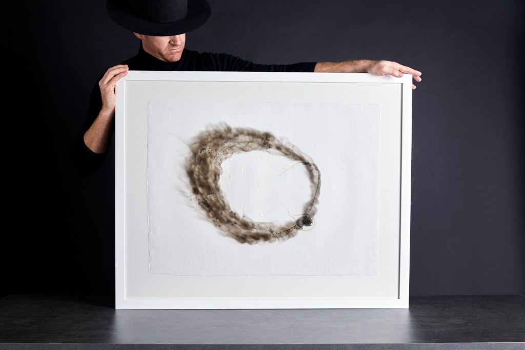 Skulptur i brent asketre inspirerte til form på håndlaget papir. Benyttet materialer fra skulpturen til å lage bilde. Flamme fra en bit asketre (sot og flamme) og voks som emnene impregneres med etter trefelling for å tørke kontrollert. Tidsmessig er det ytterpunktene i arbeidene. Det raske i flammene og det sakte med tørketid.